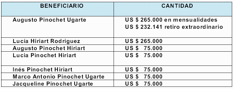 i.- Desde el mes de octubre de 2002 al mes de julio de 2004, María Lucía HIRIART RODRIGUEZ recibió la cantidad de US$265.000,00 correspondientes a retiros del Trust mantenido por GLP Limited en el Banco de Chile N.Y., para lo cual, según se ha dicho, firmó junto a su esposo otorgando un mandato a Oscar AITKEN. Para recibir esta cantidad, firmó mensualmente un libro a Oscar AITKEN al hacerle entrega de la parte del dinero que se le asignaba, con lo cual recibió beneficios de las inversiones en el extranjero, sin que dicha inversión fuera conocida por las autoridades chilenas y no consta se tributara por su cónyuge o por ella respecto de dichas sumas.