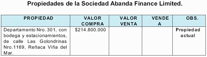 k.- Lucia Hiriart solicitó al mandatario de Augusto Pinochet Ugarte firmara la escritura pública de venta del departamento ubicado en calle Las Golondrinas, Reñaca, Viña del Mar, el cual le había sido adjudicado a PINOCHET Ugarte en la liquidación de la sociedad conyugal, el cual fue vendido a la sociedad con acciones al portador Abanda Finance de propiedad del mismo Pinochet Ugarte, cuyos dineros fueron enviados desde la cuenta que la sociedad con acciones al portador Eastview Finance mantenía en el Banco de Chile en Nueva Cork, los cuales, finalizada operación de compra y venta, fueron remesados el mismo día al extranjero a la cuenta de la mencionada sociedad Eastview Finance en el Banco de Chile N. Y. De esta forma ante cualquier fiscalización del Servicio de Impuestos Internos se tenía el respaldo necesario, lo que de hecho ocurrió y la autoridad tributaria manifestó su conformidad con lo actuado en su oportunidad. Con esto se logró el objetivo por el cual se realizaron las constituciones de las sociedades y el traspaso artificial de dineros.